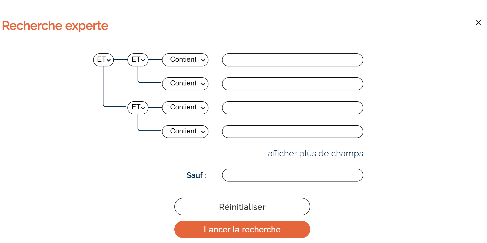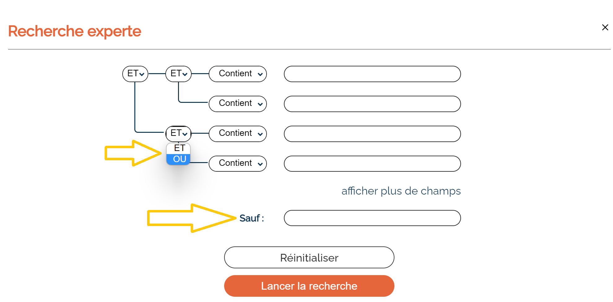 La recherche experte vous permet de définir les liens entre chacun des mots en choisissant entre ces trois possibilités :